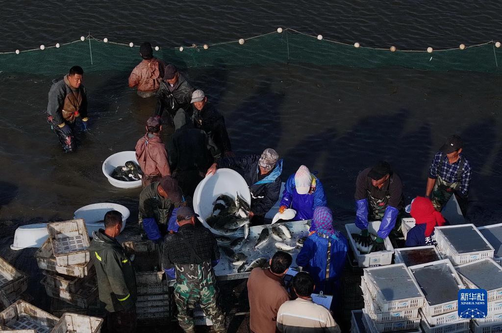 10月11日,唐山市曹妃甸区柳赞镇一家河豚鱼繁衍协作社的社员在水池捕捞河豚鱼(无东谈主机像片)。
